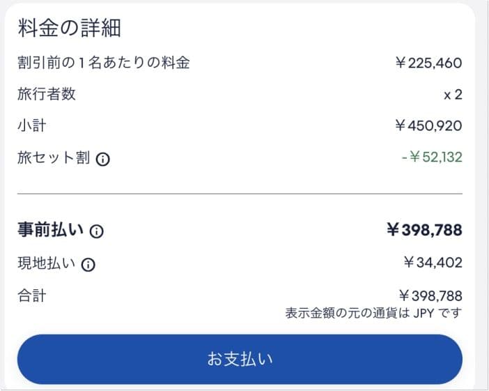 - 航空券:203,900円(1人あたり101,950円)