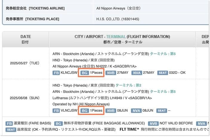 2つ目は、予約後に届く、eチケットレシートやマイページから確認します。この場合「1 Pieces」と記載されているので、往復便とも1個ずつということがわかります。